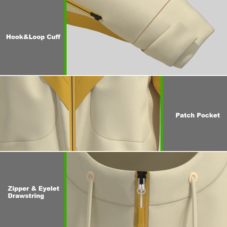 Hood Assembly: Adjustable attached hood with windproof and waterproof protection for head & neck.