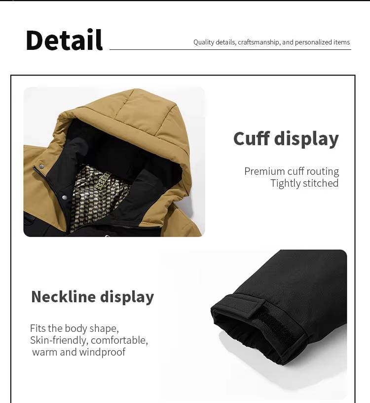 Cuff: The cuffs are designed with adjustable Velcro for warmth and wind resistance.