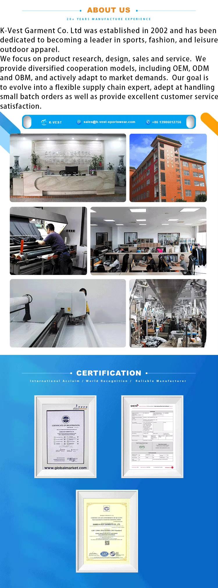 Company description: “Xiamen K-Vest Garments Co.,ltd specializes in custom wholesale outdoor sportswear, offering 13 years of expertise in clothing customization and one-stop apparel services. With a strong focus on eco-friendly.