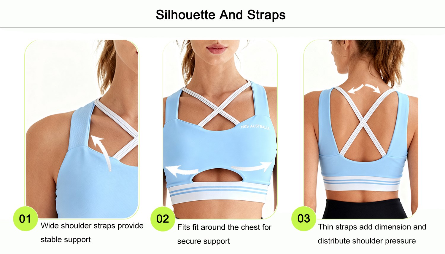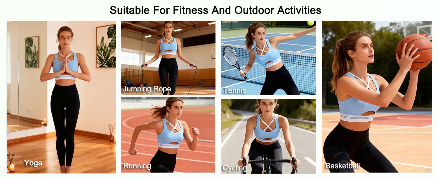 ①Straps:The straps feature a dual design combining a wide strap for stable support and a slim strap for layered aesthetics, effectively distributing shoulder pressure and accommodating a wide range of motion during activities like yoga.