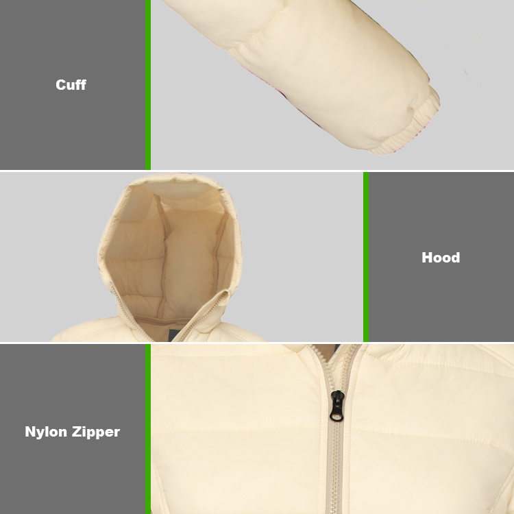 Filling: 60G/M2 washed cotton.Body, collar, hat+sleeves made of DuPont imitation down cotton.